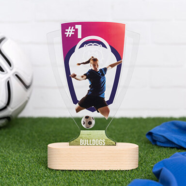 Für Schul- oder Erwachsenenturniere, Amateur- oder Profisport, Mannschafts- oder Einzelsportarten. Ob Fußball, Basketball, Handball, Leichtathletik, Schwimmen, Tennis, etc. Hier kannst du eine Sporttrophäe oder eine Gedenktafel für den Champion (oder die Champions im Falle einer Mannschaft) personalisieren. Du kannst das Vereinswappen oder -logo, den Namen der Mannschaft oder des Turniers, das Jahr oder das Datum der Feierlichkeiten usw. hinzufügen.
